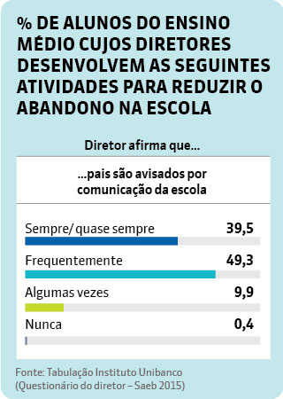 Dados tabulados pelo Instituto Unibanco das respostas dos diretores ao questionário do Saeb indicam que grande parte dos gestores tem encontrado dificuldades para lidar com o problema: 41% dos estudantes estudam em escolas onde os diretores dizem que as soluções adotadas para reduzir o abandono ainda são insatisfatórias. Outros 5% estão em escolas onde os gestores reconhecem que, apesar de haver esse problema, nada ainda foi feito para combatê-lo. Apenas 24% consideram os resultados de ações contra o abandono satisfatórios.