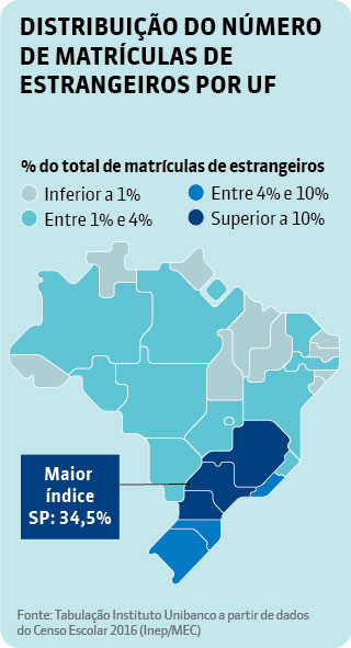 Ainda de acordo com o Censo, mais de um terço (34,5%) das matrículas de alunos de outras nacionalidades estão concentradas em São Paulo. Por conta do fluxo histórico de imigrantes que recebe, o estado é um dos mais estruturados em termos de normatizações que asseguram o direito à educação para essa população.