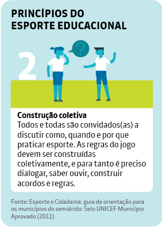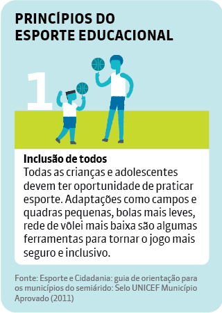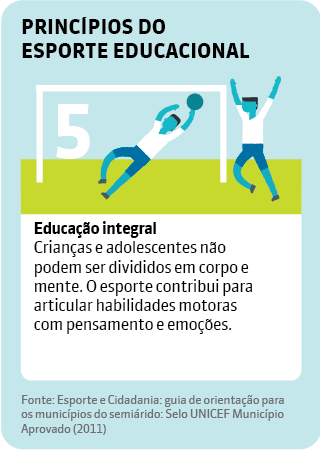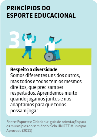 O Unicef considera o esporte como atividade fundamental para o desenvolvimento humano e, por isso, recomenda seu uso como ferramenta educacional dentro das escolas. Na publicação Esporte e Cidadania: guia de orientação para os municípios do Semiárido (2011), a organização salienta que os professores devem transmitir os conhecimentos esportivos de maneira que os estudantes desenvolvam as habilidades necessárias para as exigências da vida social, exercer sua cidadania e obter mais qualidade de vida. Para isso, as aulas devem se basear em cinco princípios: inclusão de todos, construção coletiva, respeito à diversidade, autonomia e educação integral.