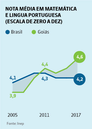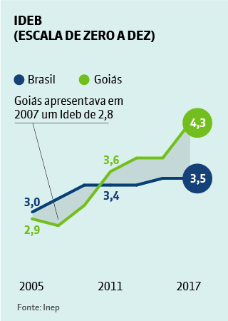 O primeiro caso a ser retratado é o de Goiás, única rede estadual no país que conseguiu superar a meta traçada pelo MEC para esta etapa. De 2007 a 2017, enquanto o Ideb nacional variou apenas 0,3 ponto (de 3,2 para 3,5), Goiás deu um salto de 1,5 ponto (de 2,8 para 4,3), superando em 0,1 ponto a meta de 4,2 estimada para 2017. Foi a maior média do Brasil entre redes públicas estaduais no índice, que congrega taxas de aprovação com o desempenho dos alunos em testes de português e matemática.