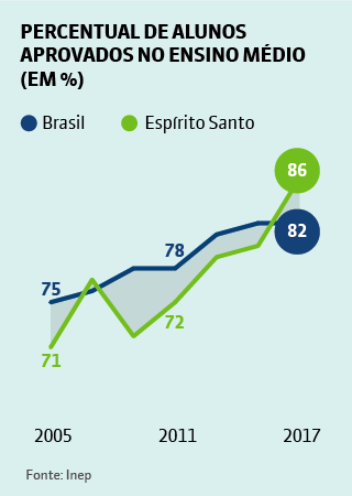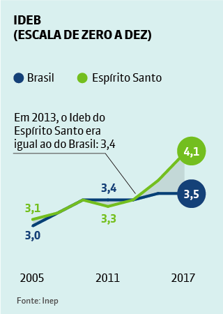 Entre 2013 e 2017, nenhum estado avançou tanto no Ideb (Índice de Desenvolvimento da Educação Básica) do Ensino Médio público estadual quanto o Espírito Santo. Esse movimento ocorreu pelo aumento nas taxas de aprovação na rede estadual (de 79% para 86%) e, principalmente, pelo fato de os jovens capixabas terem o melhor desempenho do país nos testes de Matemática e Língua Portuguesa entre as redes estaduais. O Estado avançou, no período, 13 pontos em Português e 20 em Matemática na escala do Saeb (Sistema de Avaliação da Educação Básica). Para efeito de comparação, no mesmo intervalo de tempo, o Brasil melhorou em apenas quatro pontos sua média em Português e permaneceu estagnado em Matemática.