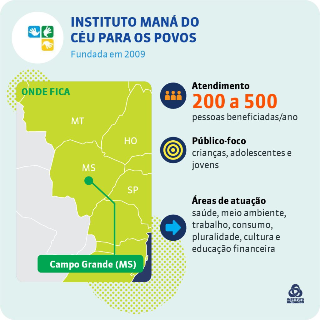 O Instituto de Desenvolvimento Humano, Social, Econômico e Cultural Maná do Céu Para os Povos, de Campo Grande (MS), foi criado em 2009, a partir da articulação de uma rede de colaboradores e parceiros para realizar ações voltadas à garantia de direitos sociais às famílias em situação de extrema vulnerabilidade da região do Prosa, que abrange 14 bairros periféricos da cidade.